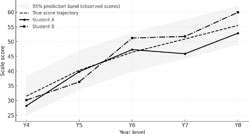 Figure 2 reveals the original “true score” trajectory using a dashed black line. The grey zone surrounding the black line indicates how far scores on the test might depart from this line at any given time point due to measurement error. As can be seen, the trajectories for students A and B are clearly within the grey zone.3